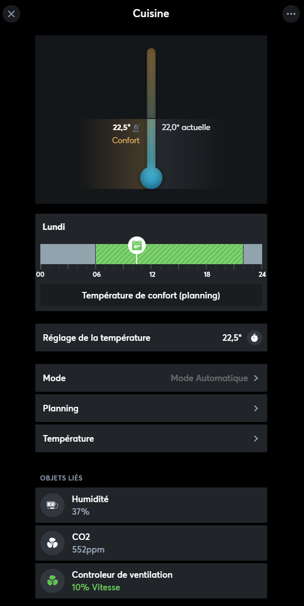 Dans l’exemple suivant, nous lions le thermostat intelligent de la cuisine avec des objets supplémentaires.