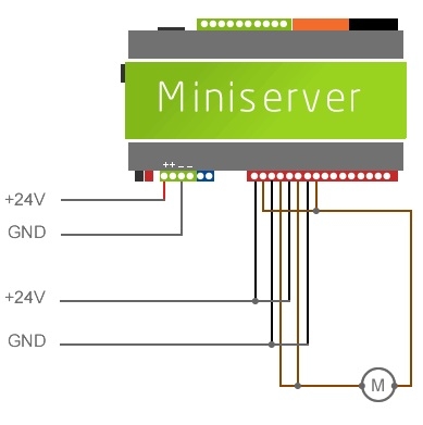 Vous trouverez ci dessous un exemple de câblage pour contrôler un moteur DC. Ces moteurs sont souvent utilisé avec les stores et volets roulants. Contrairement aux moteurs AC, la direction est modifiée lorsqu’on inverse la polarité du moteur.