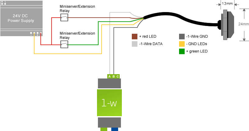 Les capteurs de température sont connectés aux entrées analogiques du Miniserver ou d’une extension. le +24 V et le GND peuvent, si nécessaire, être bouclés d’un capteur de température à l’autre, mais chaque capteur nécessite son propre lien vers une entrée analogique.