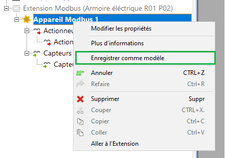 Après avoir ajouté tous les capteurs et actionneurs nécessaires à votre appareil Modbus, vous pouvez l’enregistrer comme modèle afin de pouvoir l’utiliser à nouveau.