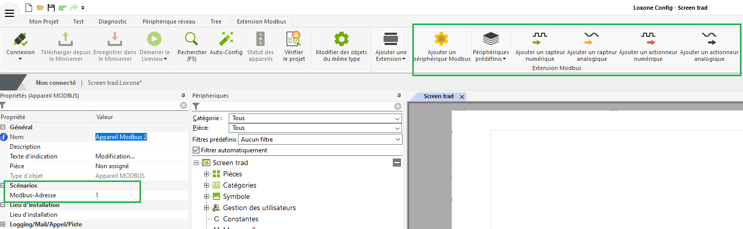 Pour créer un capteur ou un actionneur, sélectionnez le périphérique Modbus dans l’arborescence des périphériques. Dans le ruban supérieur, le bouton «Capteurs et actionneurs» affiche à présent les capteurs et actionneurs analogiques et numériques. Sélectionnez le type souhaité et il est ajouté sous le périphérique Modbus sélectionné.