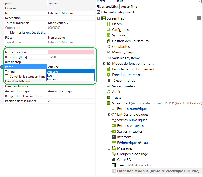 Si vous cliquez sur l’extension Modbus dans la fenêtre de l’arborescence périphérique, vous verrez les propriétés de l’Extension affichées dans la fenêtre des propriétés à l’extrême gauche de l’écran. Ici, vous devez définir le débit en bauds, les bits d’arrêt et la parité. Ces paramètres sont spécifiques au produit. Veuillez donc trouver les détails dans la fiche technique du fabricant de l’appareil Modbus que vous utilisez.