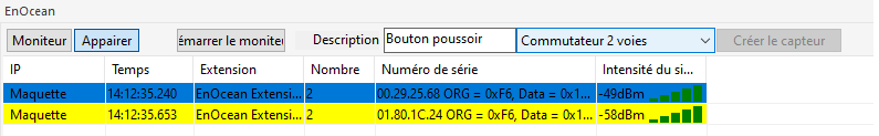Dans le cas des capteurs, vous pouvez utiliser le moniteur EnOcean pour voir quelles données sont envoyées par l’appareil.