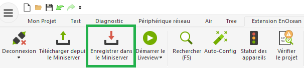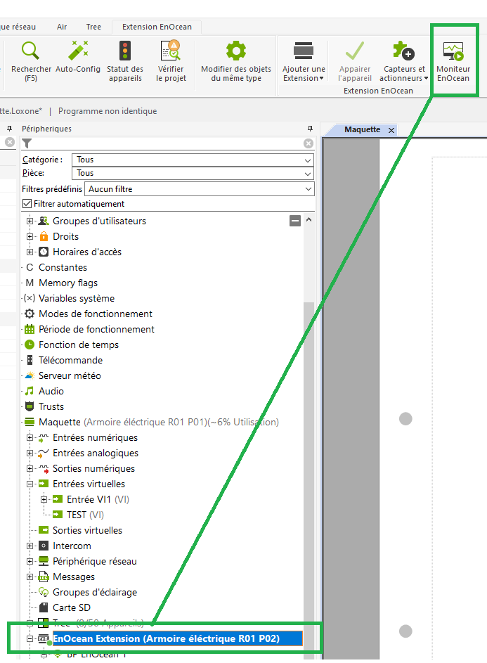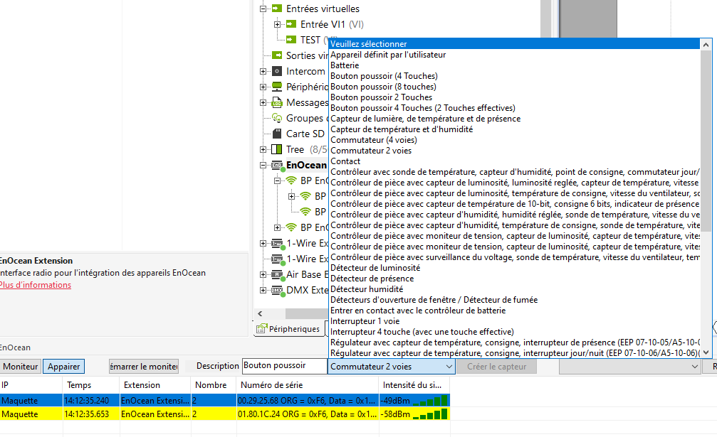 Sélectionnez l’extension EnOcean dans l’arborescence périphérique et cliquez sur le bouton « Moniteur EnOcean ».