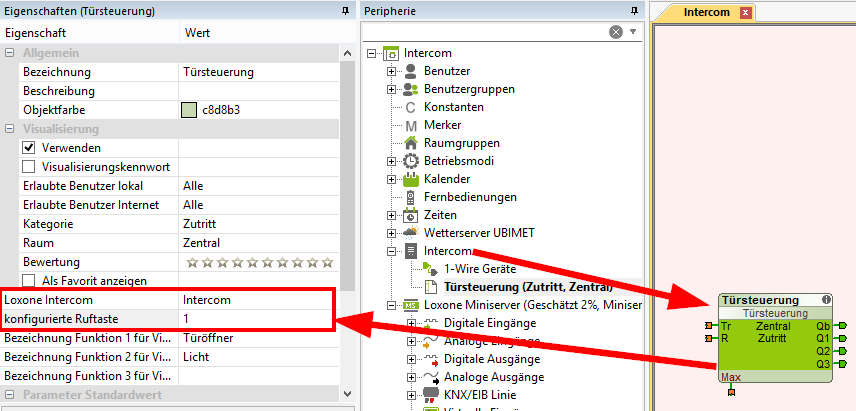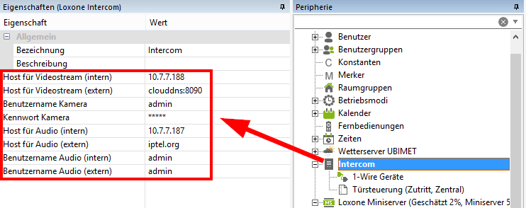 Le mot de passe Audio doit être entré dans les propriétés de l’Intercom dans Loxone Config.