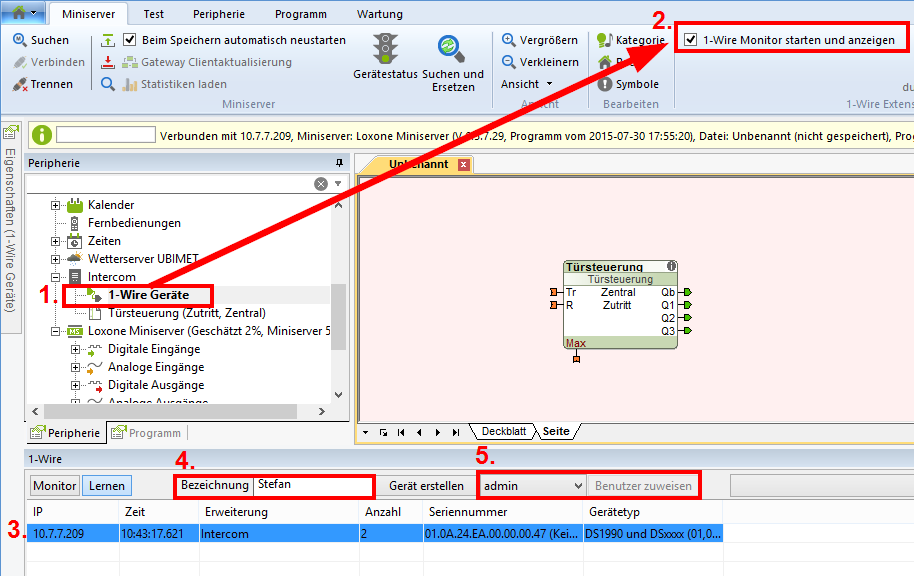 Une fois que l’Intercom est connecté au réseau, il faut le programmer. Démarrer le logiciel Loxone Config et connectez vous au Miniserver. Téléchargez le programme actuel du Miniserver (sauf si vous démarrer un programme neuf) et ensuite cliquez sur « Recherche périphérique ».