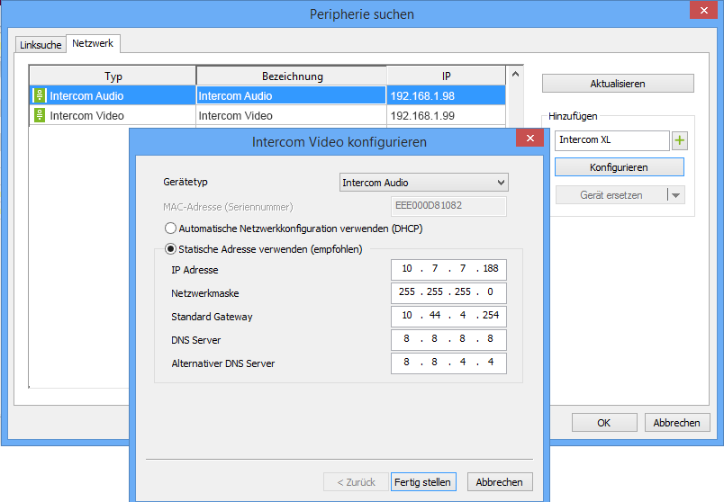 La boite de recherche s’ouvre. Dans l’onglet « réseau »  la recherche va lister tous les appareils disponible sur votre réseau et notamment les produits réseau Loxone. Sélectionnez « Intercom Audio » et cliquez sur  « Configurer ». Vous pourrez ensuite configurer l’adresse Ip et la passerelle.