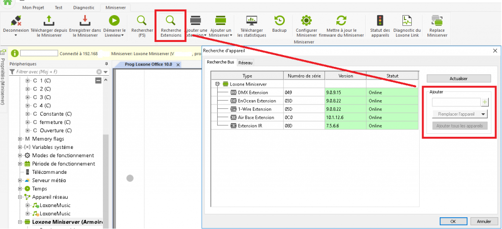 Pour insérer une ou plusieurs extensions, cliquez sur « Miniserver » dans le logiciel Loxone Config puis sur « Recherche Extensions ». Une recherche démarre donc sur le réseau. Les différents Miniservers sont répertoriés avec leurs Extensions connectées dans la fenêtre des résultats de la recherche. En sélectionnant une seule Extension et en cliquant sur le signe « + », une seule Extension est insérée dans la programmation. Si vous souhaitez insérer immédiatement toutes les extensions connectées dans la programmation, cliquez sur « Ajouter tous les appareils ». Ici, il est également possible de remplacer un appareil.