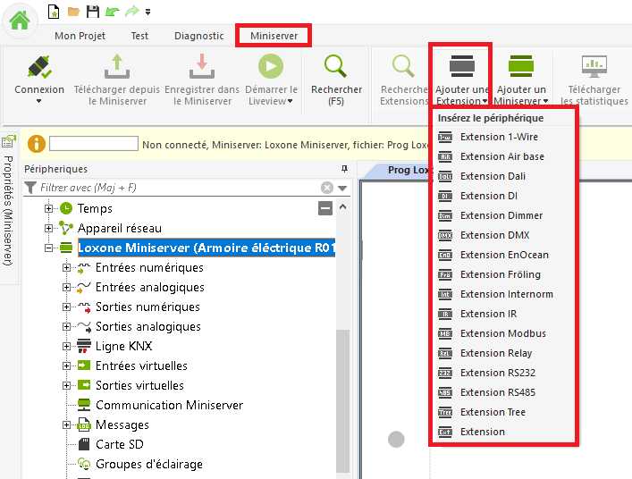 Si aucune Extension n’est connectée au Miniserver, elles ne peuvent pas être trouvées dans la recherche. Cependant, vous pouvez déjà commencer la programmation. Connectez-vous à votre Miniserver et téléchargez la programmation existante (le cas échéant) à partir du Miniserver.