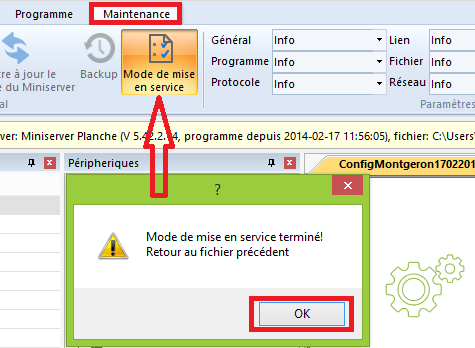 Pour quitter le mode de mise en service, cliquez à nouveau sur le bouton de Mode de mise en service.