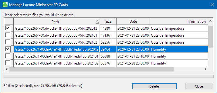 Les fichiers sont marqués pour suppression en cochant la case correspondante. Les statistiques sélectionnées sont supprimées