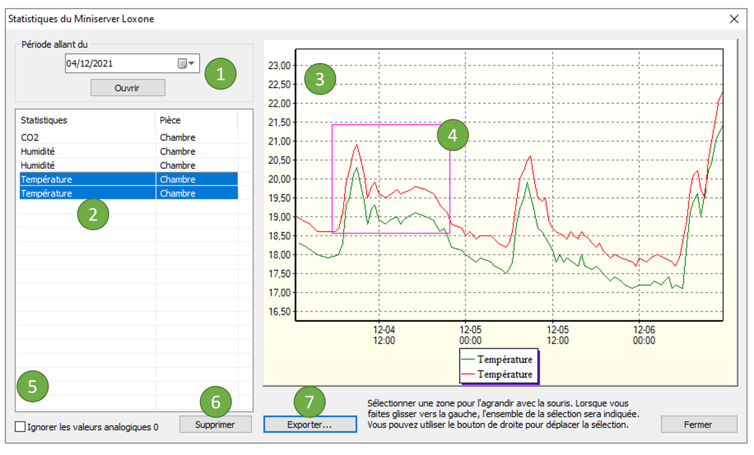 Les statistiques enregistrées peuvent être appelées et affichées dans Loxone Config.