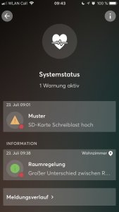 Dans l’app Loxone Smart Home, le Statut du système n’est actif que lorsqu’il existe des messages actifs. Si tel est le cas, un symbole de cœur coloré apparaît dans la barre de titre, ainsi qu’une barre de la même couleur. En cliquant sur la barre ou sur le symbole du cœur, vous obtenez une vue détaillée de l’état du système. Si aucun message n’est actuellement actif, l’état du système se trouve dans les paramètres du Miniserver.