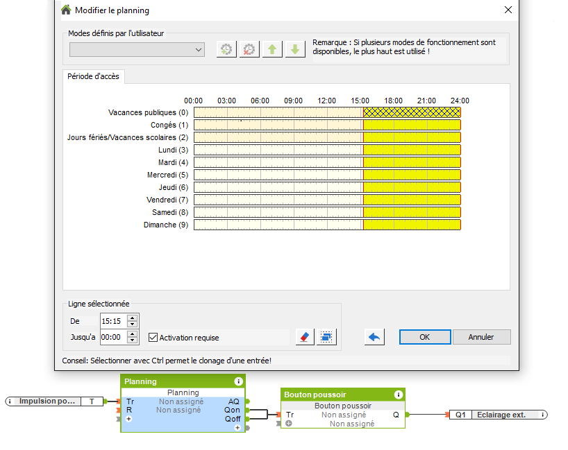 On souhaite que l’éclairage extérieur s’allume du crépuscule à minuit. Ici on utilise la fonction d’activation d’un bloc planning. On créer des plage de 15 heures à minuit. Sur ces plage on coche la case « activation requise ». On place alors l’impulsion au crépuscule sur le Tr du planning afin que la plage devienne active au moment du crépuscule. La sortie Qon du bloc planning va venir allumer le bouton poussoir qui commande l’éclairage extérieur. La sortie Qoff viendra stopper ce dernier à minuit.