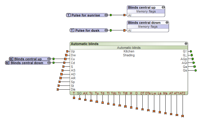 Il suffit d’utiliser l’impulsion pour le lever du soleil trouvé dans les objets Temps. Dans cet exemple, l’impulsion est relié à un memory flag, et cela permet de l’utiliser sur tous les blocs stores automatiques. Elle est reliée à l’entrée Cu qui ouvre complètement les volets. La fermeture a également été mise en œuvre en utilisant l’impulsion au crépuscule, si bien que les volets se ferment le soir.