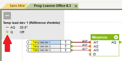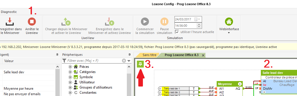 Cet outil est activé par l’icone de punaise (3.), uniquement accessible en mode Liveview. Cet icône se trouve en haut à droite de la fenêtre de programmation dans Loxone config et il faut cliquer au préalable sur un bloc fonction (2.) ou tout autre objet qui dispose d’une valeur qui peut être suivie (trackable).