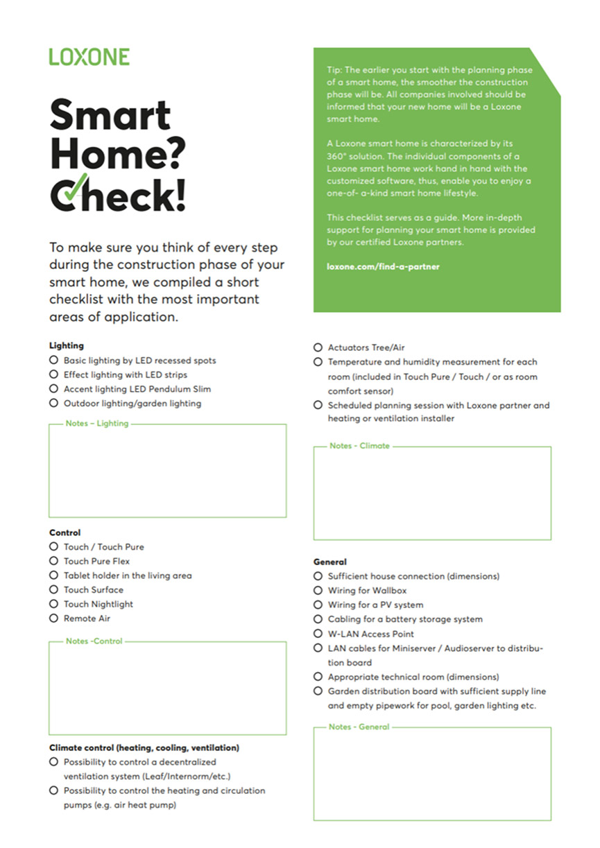 La liste de contrôle de la maison intelligente de Loxone est un guide complet, conçu pour vous aider à planifier et à mettre en œuvre les solutions d’automatisation de Loxone dans votre future maison. Afin de vous assurer que vous pensez à chaque étape de la phase de construction de votre maison intelligente, voici une courte liste de contrôle avec les domaines d’application les plus importants.