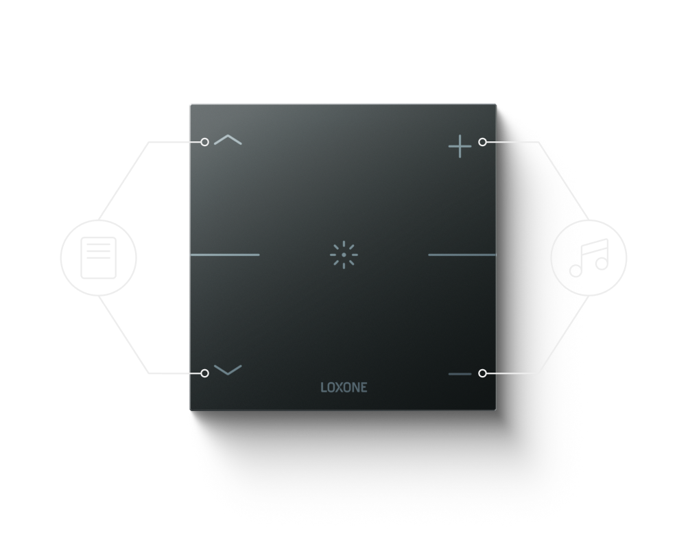 Le standard des touches Loxone est le résultat de l’expérience de milliers de projets et réunit sur le Loxone Touch Pure toutes les fonctions qui sont utilisées quotidiennement dans chaque pièce. Avec cinq points tactiles clairement définis, il permet de commander intuitivement l’éclairage, l’ombrage et la musique.