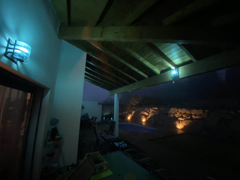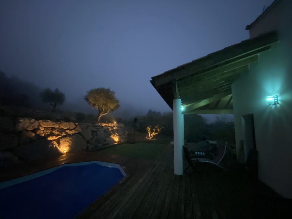 Nous avons opté pour la solution Loxone pour son intercompatibilité avec les éléments présents chez notre client. Grâce à l'extension relay, nous avons pu faire communiquer les modules Somfy avec le Miniserver. Une extension modbus, nous permet de relier la passerelle de la climatisation gainable. Couplé aux sondes de qualité d'air et à l'ombrage automatique, nous avons pu programmer une gestion de la température pièce par pièce. Fini les retours de déplacement dans une maison froide...Pour l'extérieur, nous avons agrémenté la restanque de pierre et les oliviers bicentenaires de spots blancs chauds. Nous avons également mis en place avec quelques petites programmations supplémentaires des ampoules et bandeaux RGB d'une grande marque afin de ne pas repasser de câble dénaturant l'extérieur de cette villa.