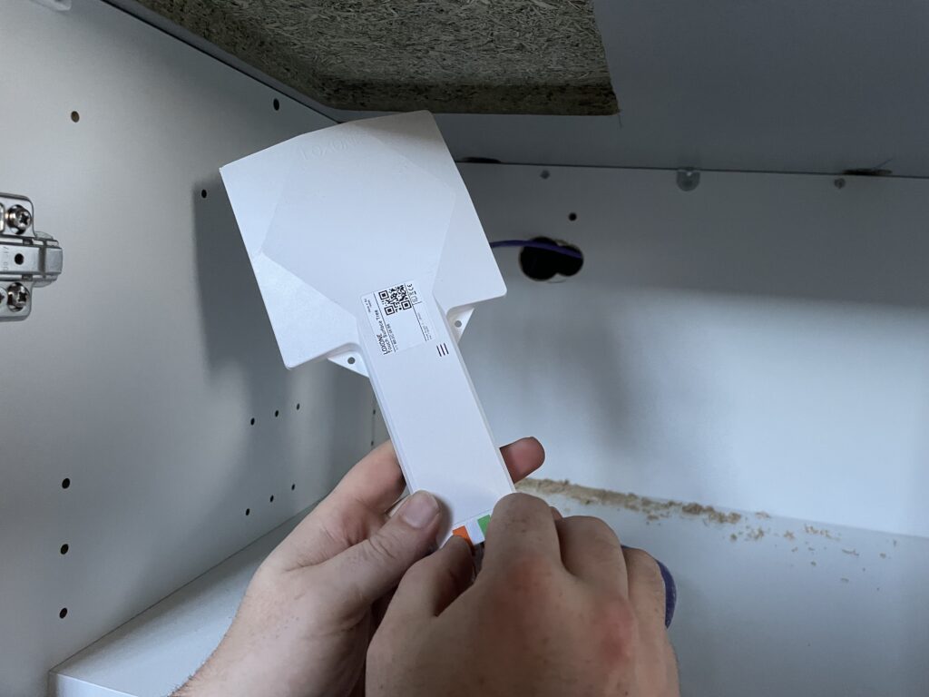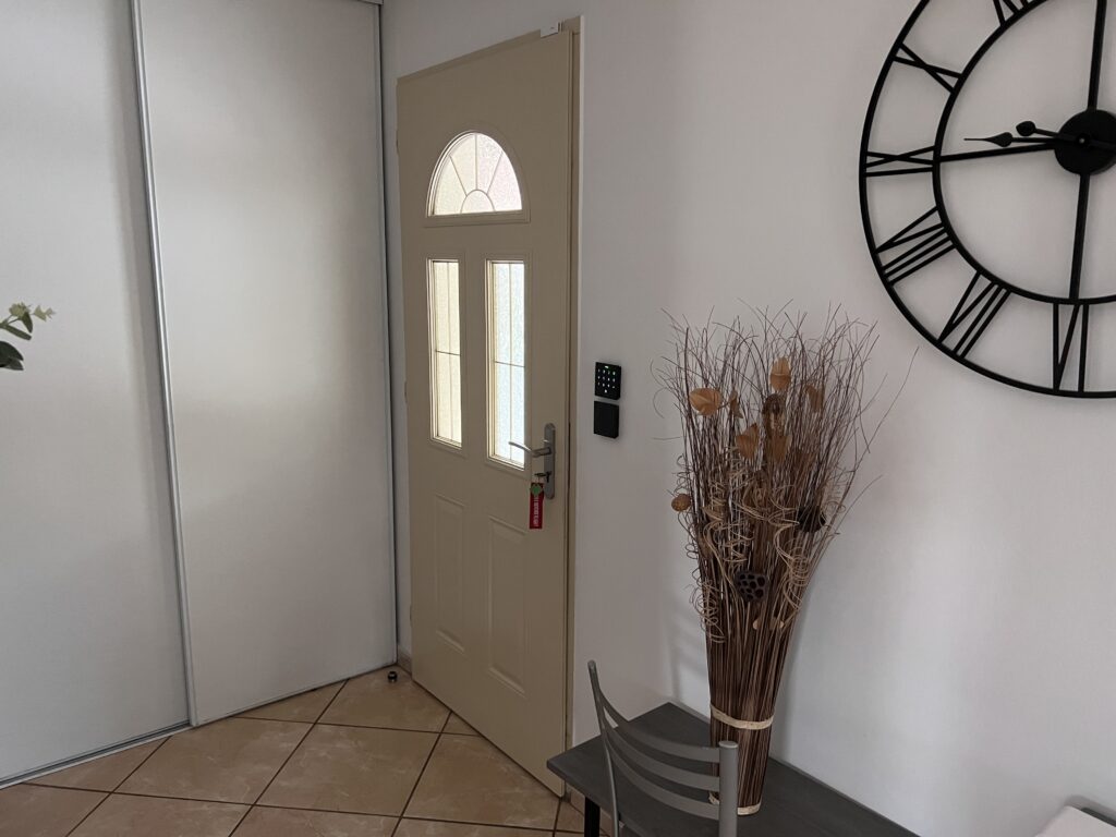 Les lumières s’allument et s’éteignent en suivant nos déplacements toujours accompagner par la musique. Dans la pièce à vivre un IPad trône sur le mur, me laissant apercevoir la régulation de chauffage dans les pièces de nuit. Curieux, j’apprends que celle-ci est possible en couplant plusieurs fonctions comme l’ombrage automatique, les contacts d’ouverture ainsi que la détection de présence. Je remarque également un bouton en verre avec plusieurs symboles, un Touch Pure Flex a été configurer pour y commander la température de la pièce de jour, mais aussi les lumières et les volets. Au fil du repas notre hôte faisant des allers-retours dans la cuisine, passe sa main sur son plan de travail et la lumière s’allume. Il m’indique que le bouton a été intégrer à l’ilot central et lui permet de piloter sa lumière mais qu’il regroupe toutes les autres fonctionnalités des boutons Touch.