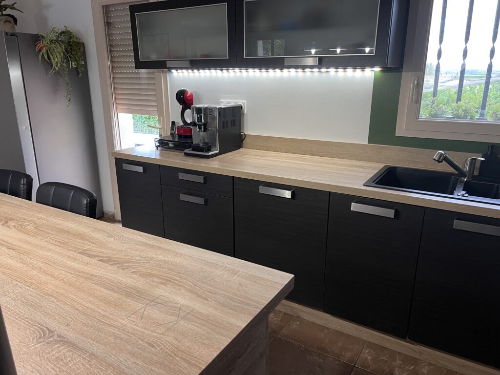 The lights turn on and off following our movements always accompanied by music. In the living room an IPad sits on the wall, letting me see the heating control in the night rooms. Curious, I learned that this is possible by combining several functions such as automatic shading, opening contacts and presence detection. I also notice a glass button with several symbols, a Touch Pure Flex has been configured to control the daytime room temperature, but also the lights and shutters. Over the course of the meal, our host going back and forth in the kitchen, passes his hand over his worktop and the light comes on. It tells me that the button has been integrated into the central island and allows it to control its light but that it includes all the other features of the Touch buttons.