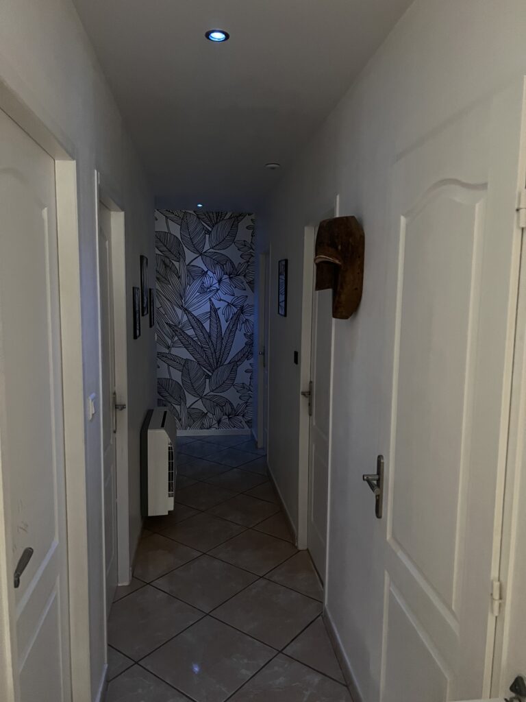 The evening is over, it's time to sleep, the house goes into night mode with several presses on the smart alarm clock: the music stops, the lights go out, a message announces that the alarm is activated. In the middle of the night, I get up and discover that as I move around a slight blue light appears to find my way.