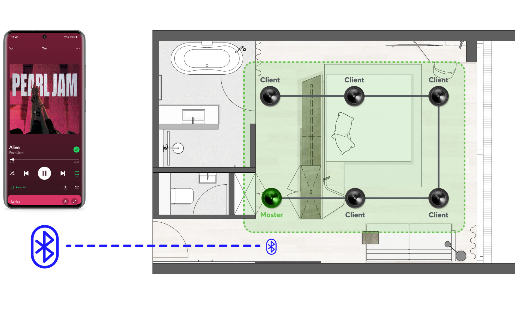 Audio content can be transmitted to the master speaker via Bluetooth from any end device. The Bluetooth capability of a master speaker can be switched on or off in the Loxone Config using logic.