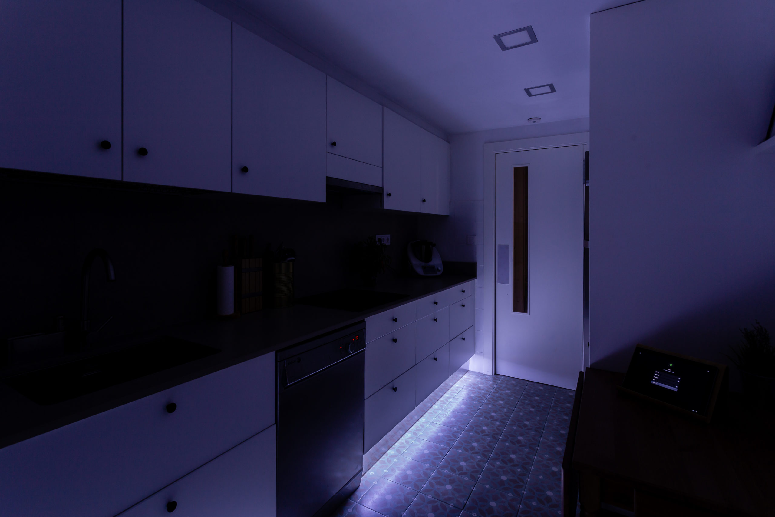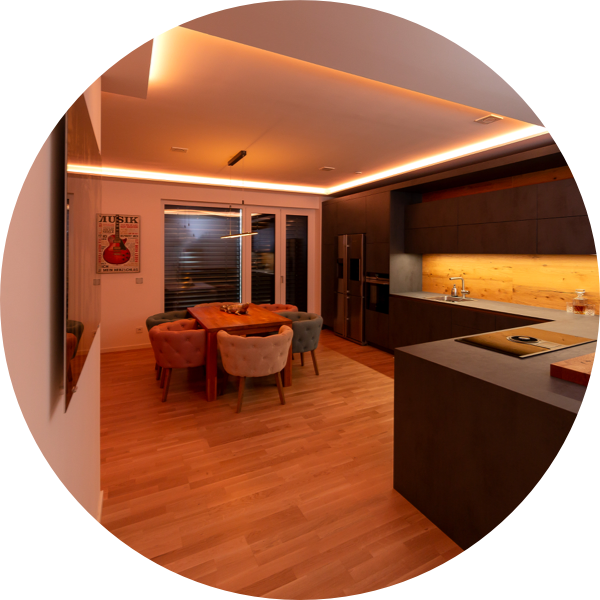 In modalità notturna, l’illuminazione viene regolata per un miglior comfort. Se devi alzarti di notte, la luce di orientamento del Touch Pure Air si accende in camera da letto, le luci si attenuano in bagno e in cucina si accende solo la striscia LED. Inoltre, tutti i dispositivi elettronici vengono scollegati dalla rete e viene attivato il sistema di allarme.