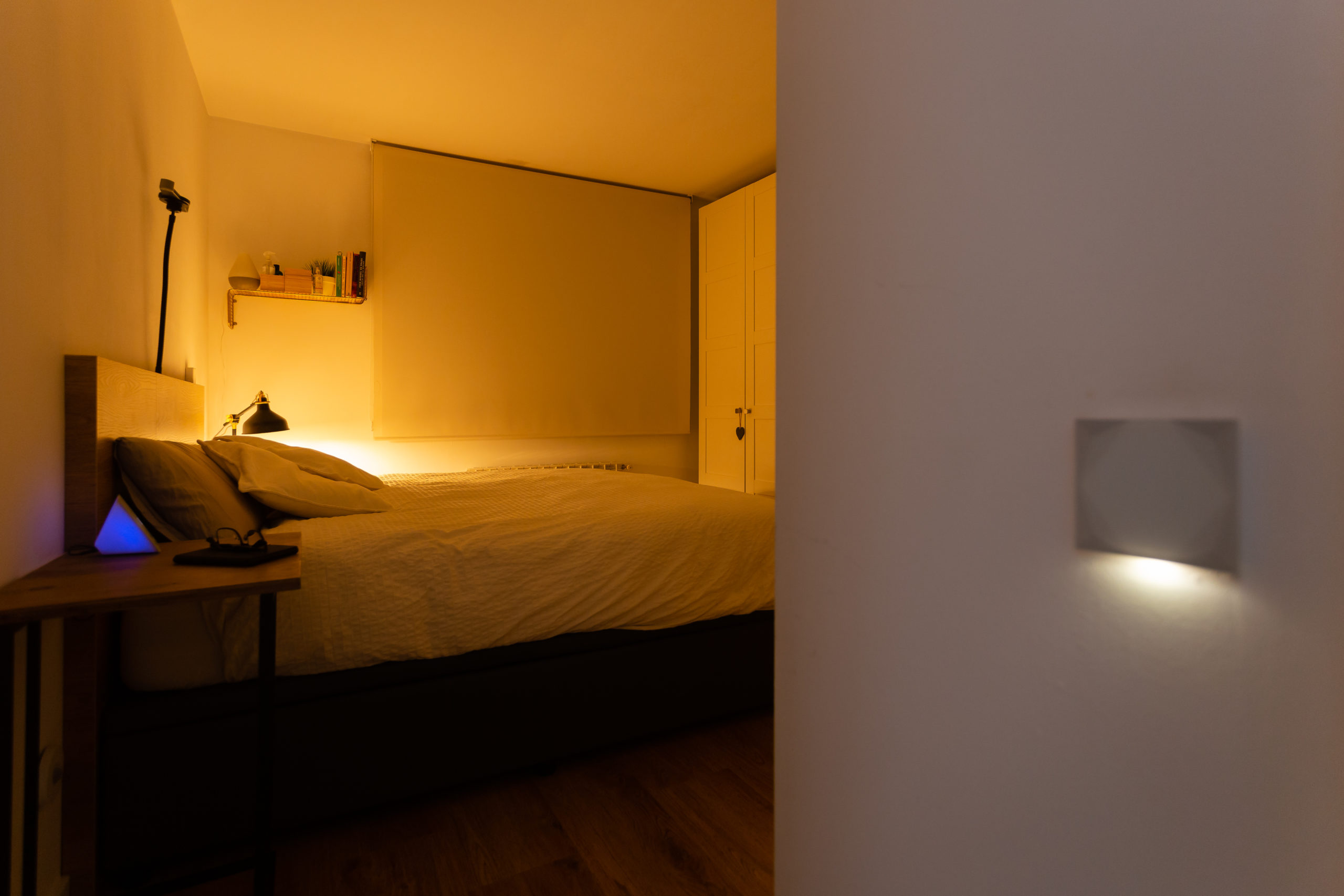 Nella stanza è stato installato il Touch Nightlight, che è un pulsante, una luce da tavolo e una sveglia allo stesso tempo. Tramite questo dispositivo è possibile avviare la modalità notturna, controllare l’illuminazione della camera da letto e le tapparelle.