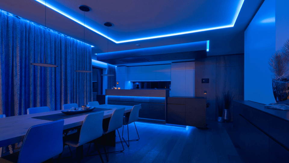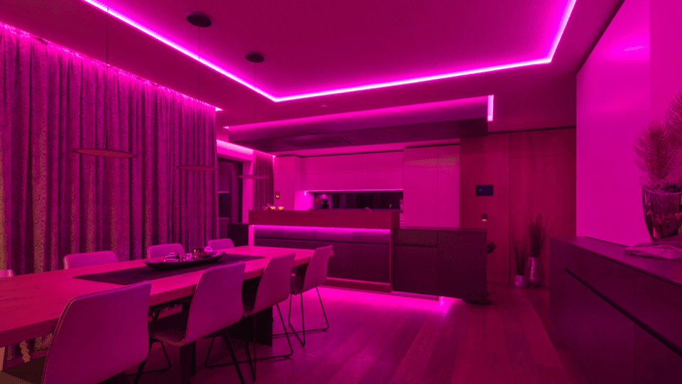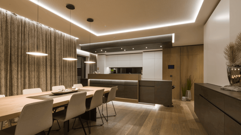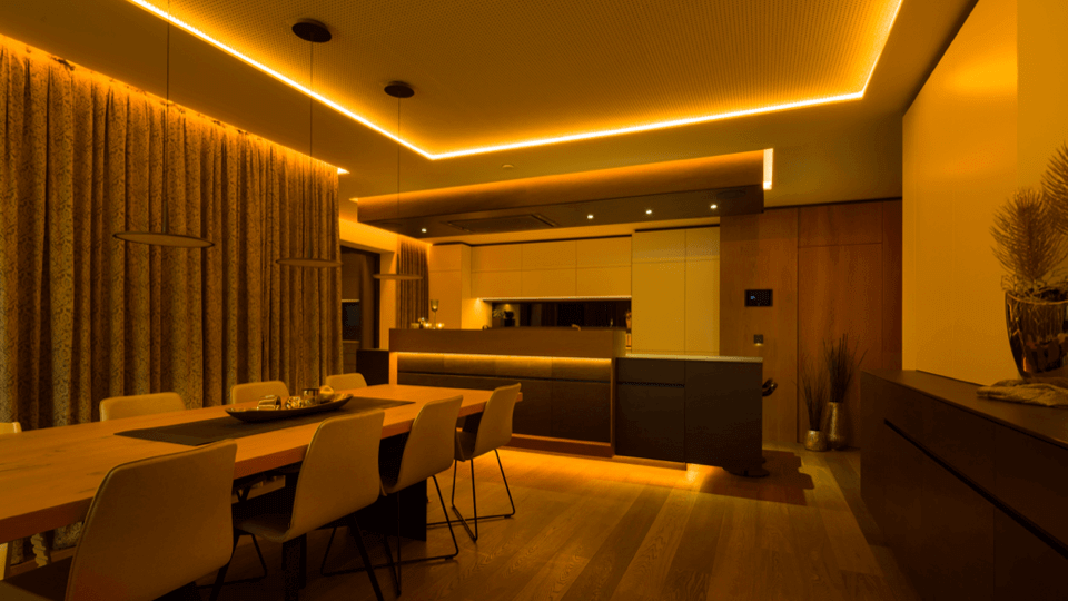 Situazioni di vita diverse comportano sfide diverse per l’illuminazione. In particolare la luminosità e il colore della luce dovrebbero spesso essere regolati individualmente. Esempio cucina-soggiorno: qui si svolge una serie di attività diverse. Non importa se i bambini fanno i compiti e la superficie di lavoro deve essere illuminata in modo luminoso o se un buon bicchiere di vino deve essere gustato con gli amici in un’atmosfera accogliente e con luci soffuse. Le sorgenti luminose a LED Loxone soddisfano tutti questi requisiti. Dimmerare le luci e cambiare i colori senza doversi preoccupare che sia complicato da installare è uno standard per noi.