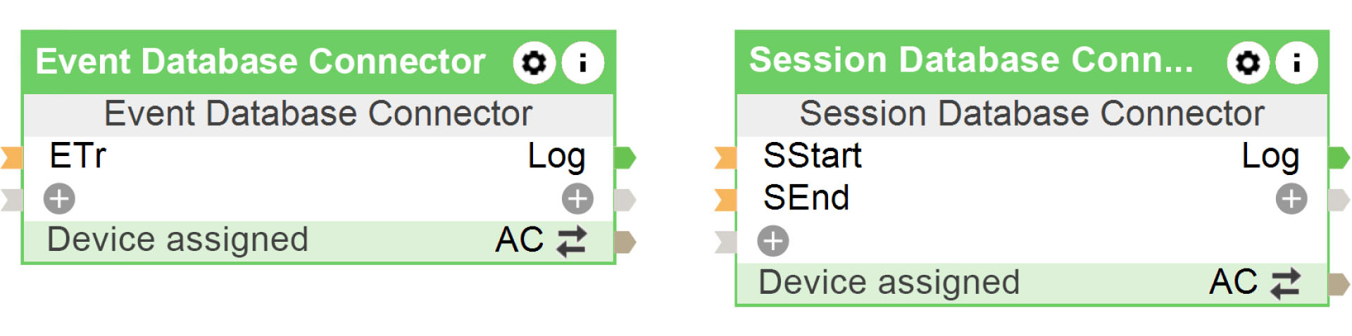 I database vengono creati in Exosphere e popolati tramite i Blocchi Config Connettore Database Evento e Connettore Database Sessione. Gli eventi sono eventi che si verificano in un singolo momento, come il pagamento di un articolo. Le sessioni sono processi con una data di inizio e una di fine, come la ricarica di una Wallbox.