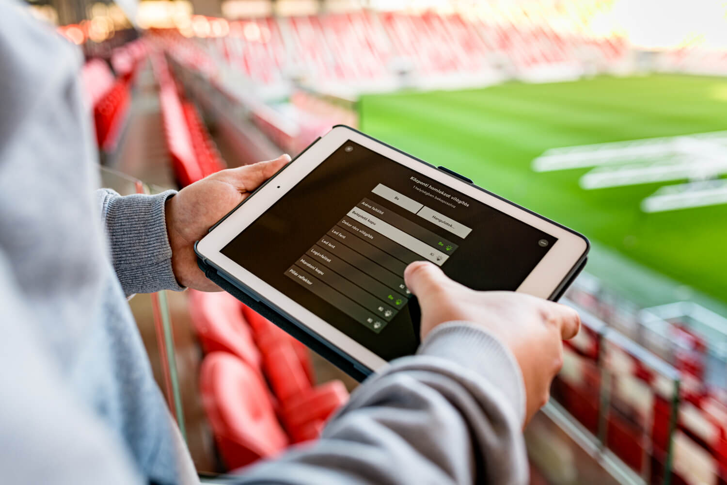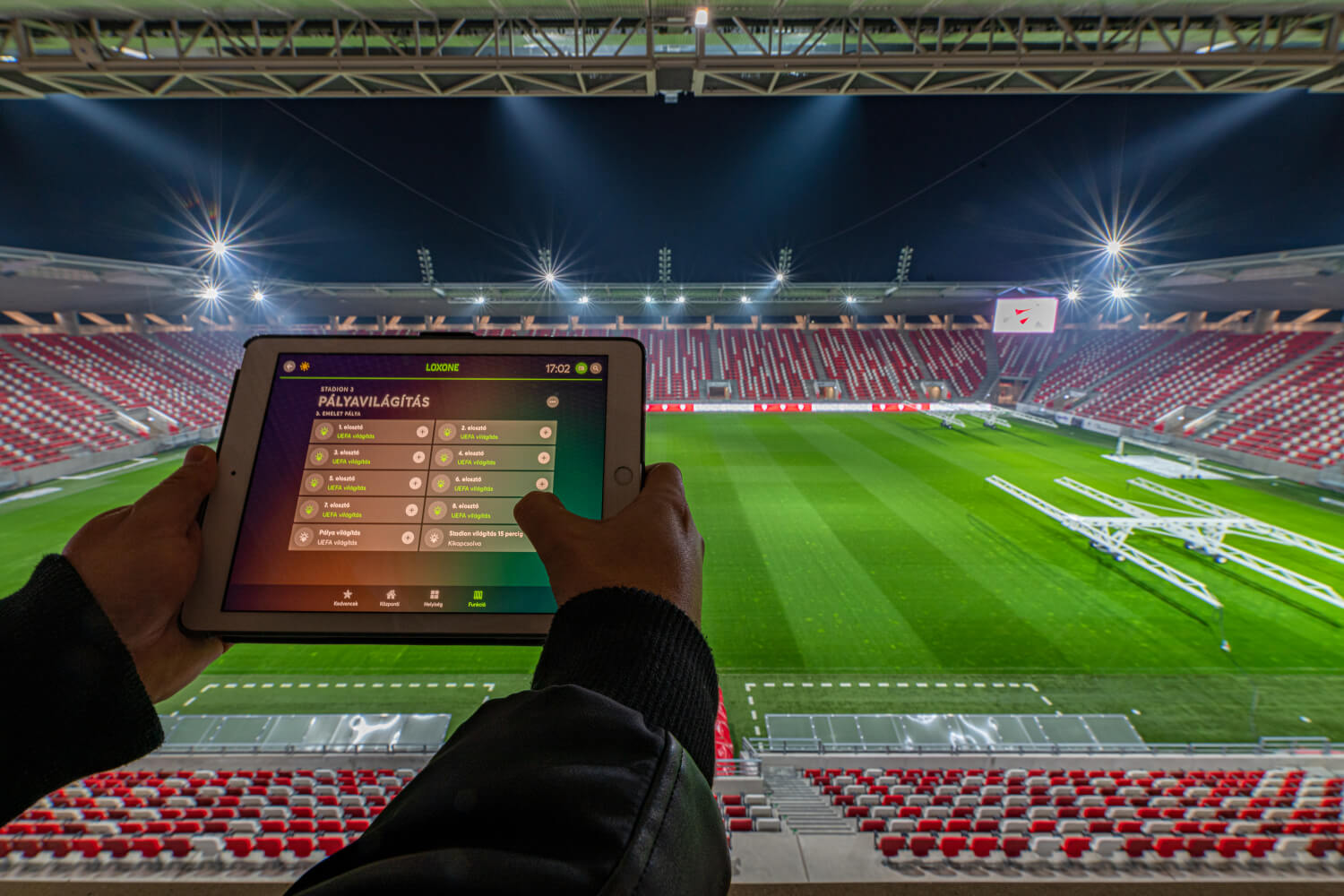 Originariamente era previsto di realizzare il progetto con un sistema diverso. Anche se il cablaggio era già in corso, il cliente ha deciso di cercare un’alternativa in questa fase del progetto. Il requisito era quello di controllare l’intera illuminazione dello stadio con un unico sistema – che si tratti di luci da stadio, luci negli spogliatoi o nell’area di moderazione. Il nostro partner Loxone ungherese, Verdom Kft., ha dimostrato al cliente che questo è possibile con Loxone e che può essere ampliato con molte altre funzioni. Il cliente ha deciso di cambiare il progetto dall’altro sistema a Loxone. Le ragioni decisive sono state: