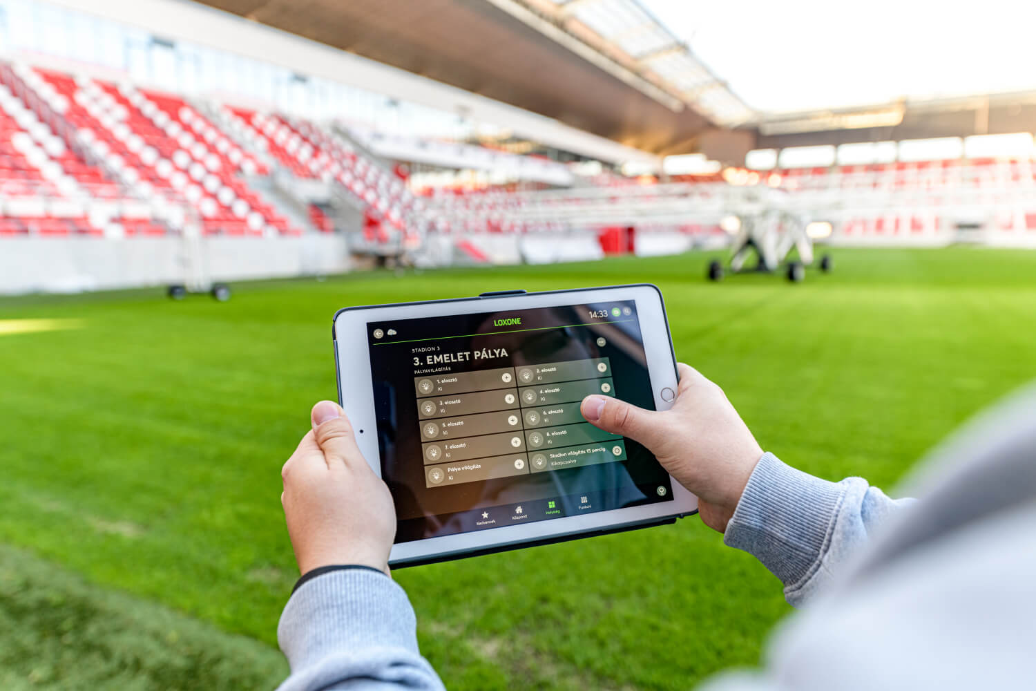 “Una volta conosciute le esigenze di illuminazione, sapevo che con Loxone sarebbe facile”, dice András Schmidt. Le luci sono controllate tramite relè Loxone. Utilizzando il blocco funzionale comando luci nel Loxone Config, András ha creato degli scenari luce predefiniti per soddisfare le esigenze del campo. Questi possono ora essere facilmente modificati tramite l’app Loxone.