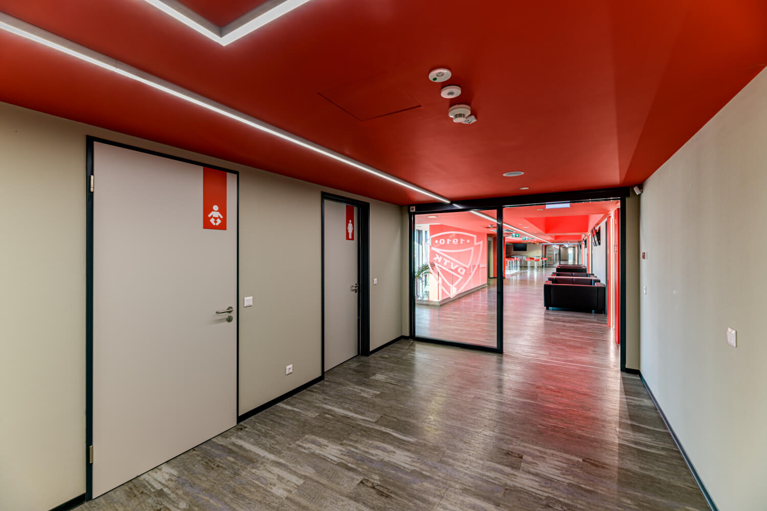 L’intera illuminazione all’interno e intorno allo stadio sono integrati nel sistema Loxone. Controllato in parte direttamente tramite relè e in parte con il Loxone DALI Extension. Tramite rilevatori di presenza si attivano le luci, ad es. nei bagni, nelle aree buffet, nei corridoi, … I giocatori, gli allenatori o il personale delle pulizie possono cambiare il scenario luce con il Touch.