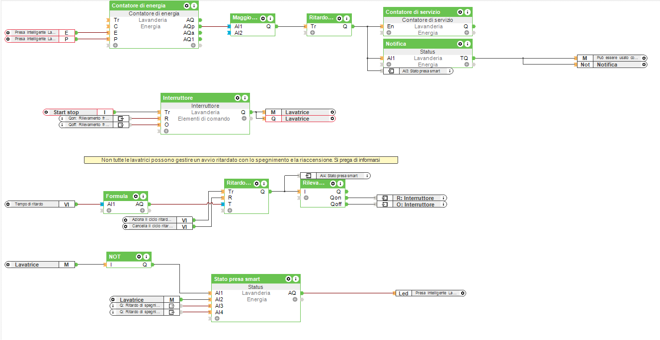 La presa intelligente Loxone consente di monitorare la potenza assorbita dall’apparecchio ad essa collegato. Per essere automatizzata, la lavatrice va quindi allacciata tramite una presa intelligente che dovrà essere sempre attiva. Quando il ciclo di lavaggio della lavatrice si avvia, la presa intelligente rileva la corrente assorbita dalla macchina. Una volta terminato il ciclo, la potenza scende quasi a 0 e allora il sistema Loxone invia una notifica al telefono o al tablet per avvertire che la lavatrice intelligente ha terminato il lavaggio. È comunque necessario impostare un ritardo sufficientemente lungo prima che venga inviata la notifica, perché un ciclo di lavaggio prevede anche delle pause durante le quali la potenza assorbita scende quasi a 0.