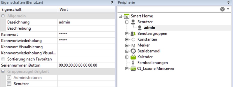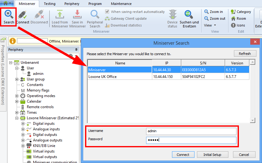 Per connettersi a un Miniserver evidenziarlo, inserire il nome utente e la password (default: admin / admin) e cliccare su “Connettere”.