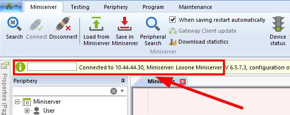 Come si può notare nella barra di stato, si è ora connessi al Miniserver.