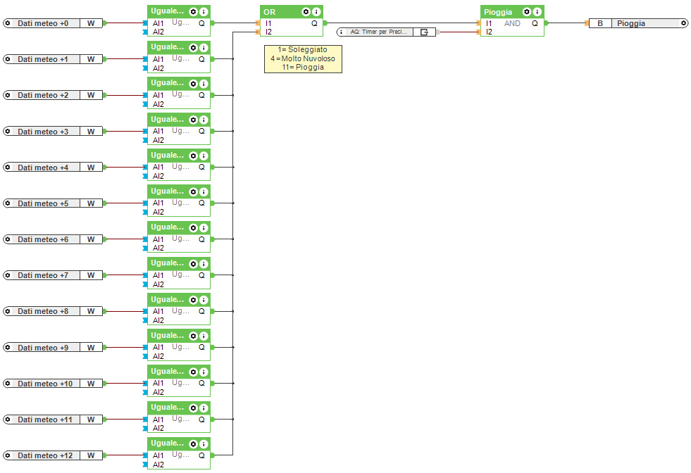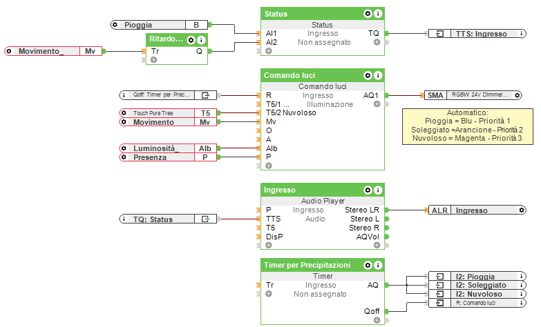 Se sono previste precipitazioni nelle prossime 12 ore, al primo movimento, verrà diffuso un messaggio in sintesi vocale. Il testo può essere modificato nel blocco stato.