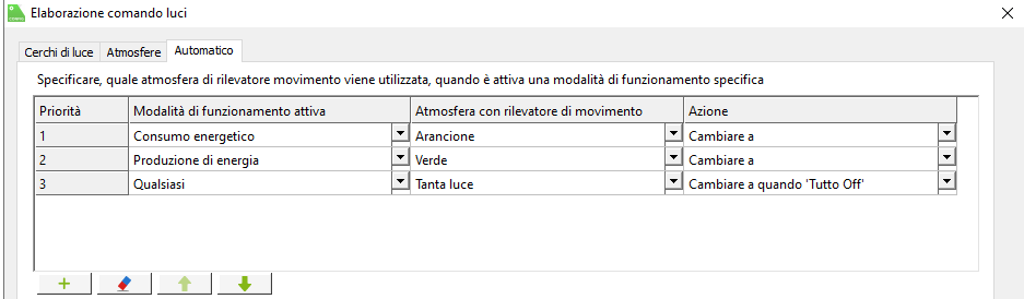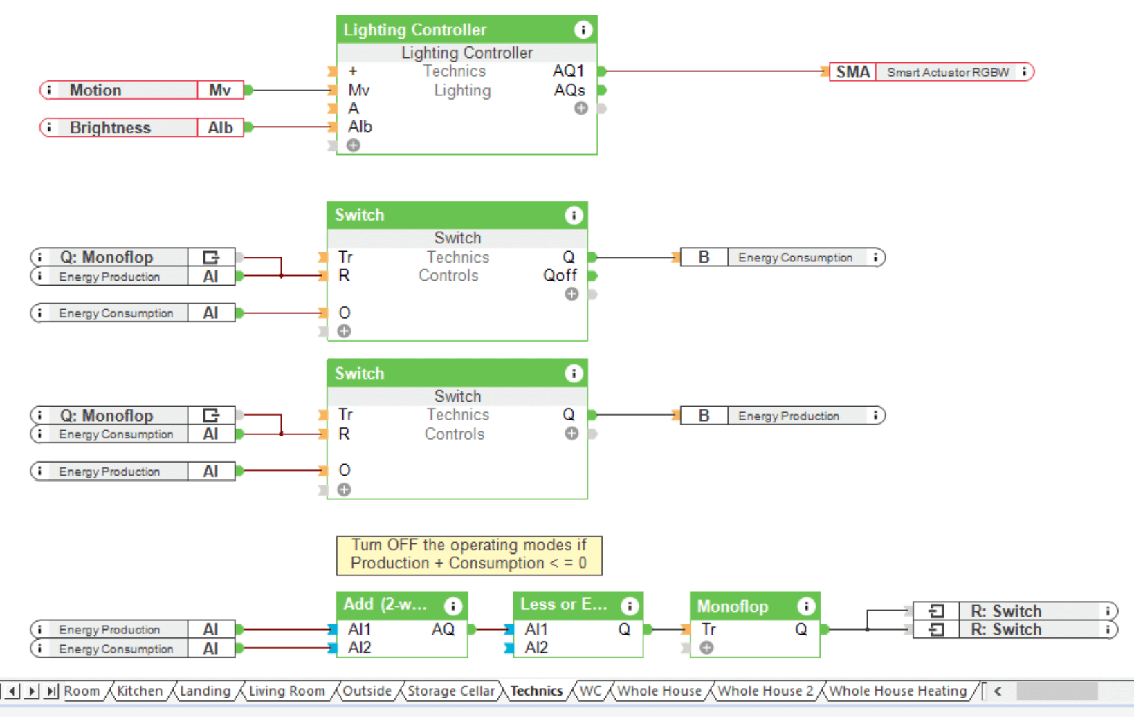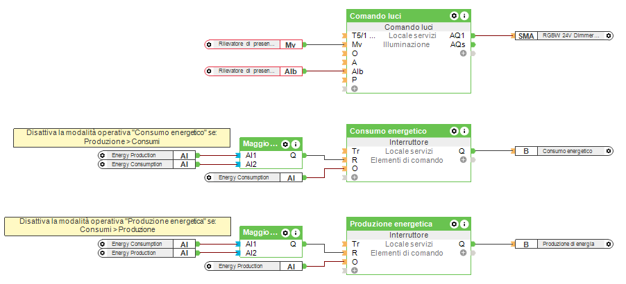 Per garantire che la luce diventi verde usando energia gratuita e arancione usando energia a pagamento, le rispettive modalità operative sono assegnate agli scenari luce sotto “Automatico” ne modulo di controllo della luce. Se viene rilevato un movimento nel locale tecnico, viene visualizzato il colore della luce. Se si consuma energia, la modalità “Consumo energetico” si attiva e il colore della luce cambia. Se viene prodotta energia, la modalità “Produzione di energia” si attiva e la luce diventa verde. Entrambe le modalità operative vengono azzerate se la somma dell’energia prodotta e dell’energia consumata è inferiore a 0. Ciò avviene tramite il blocco Somma e il blocco Minoro o uguale. Si consiglia di non visualizzare il modulo di controllo della luce, altrimenti il cliente potrebbe modificare o eliminare questi scenari luce.