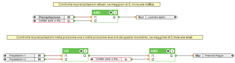 Nell’esempio ci siamo appoggiati sulle precipitazioni correnti per inviare un avviso (urgente) e sulle previsioni per le prossime due ore per inviare un avviso via email (meno urgente). Gli avvisi vengono inviati solo se il contatto della finestra rileva una finestra aperta. Se il cliente dispone di finestre controllate elettronicamente, l’avviso può essere accompagnato dal comando per chiuderle. La frequenza del controllo delle previsioni e la modalità di avviso possono essere impostati dal client