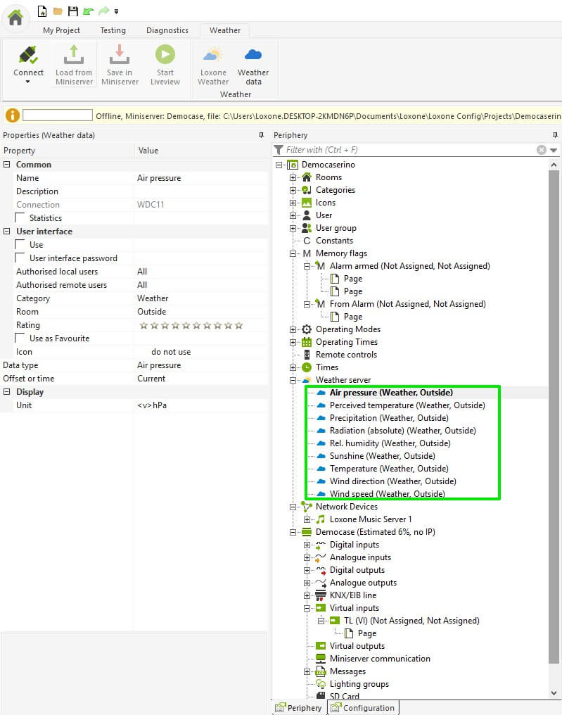 Dopo aver aggiunto il Servizio Meteo, è importante salvare sul Miniserver per assicurarsi che i dati meteo vengano ricevuti e aggiornati.