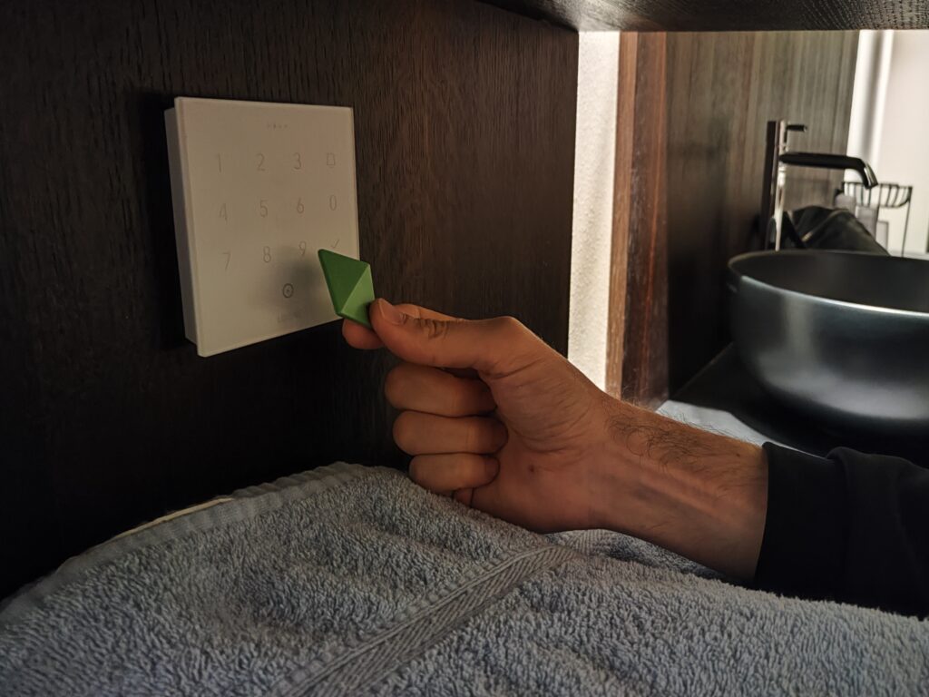 Non c'erano affatto pulsanti. Questo era l'unico modo per garantire che nessuno accendesse o spegnesse involontariamente la luce, compromettendo così l'atmosfera di benessere. Diversi scenari luminosi illuminano le stanze in modo diverso a seconda del loro utilizzo: una luce molto intensa per il personale addetto alle pulizie, un'illuminazione di base minimale per gli orari in cui la zona è chiusa agli ospiti e ovviamente una luce rilassante, non troppo intensa e talvolta colorata durante gli orari di apertura. Grazie al cambio graduale della luce, difficilmente noterai il passaggio da una scena all'altra.Particolare enfasi è stata posta sulla sicurezza durante il funzionamento della sauna. Secondo la norma, prima di accendere la sauna è necessario effettuare un controllo visivo per assicurarsi che non vi sia nulla sulla stufa e che le porte siano chiuse. Dopo un positivo controllo visivo, lo sblocco avviene tramite NFC Code Touch semplicemente apponendo il tag NFC. Ogni dipendente autorizzato ha il proprio tag NFC, così è possibile risalire a chi ha dato l'approvazione. L'NFC Code Touch fornisce feedback interessanti attraverso i LED integrati:
