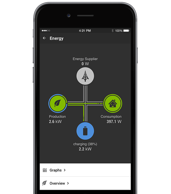 Om een goed overzicht te hebben over hoeveel energie uw woning opslaat of gebruikt, hoeft u slechts een blik te werpen op uw Loxone App. Dankzij deze App kunt u heel uw woning beheren. De Loxone App biedt u energiestatistieken die u helpen nog meer potentiële energiebesparingen te ontdekken. U kunt ook steeds uw huidige elektriciteitsconsumptie en uw elektriciteitsproductie controleren, op elk moment van de dag, waar u ook bent.