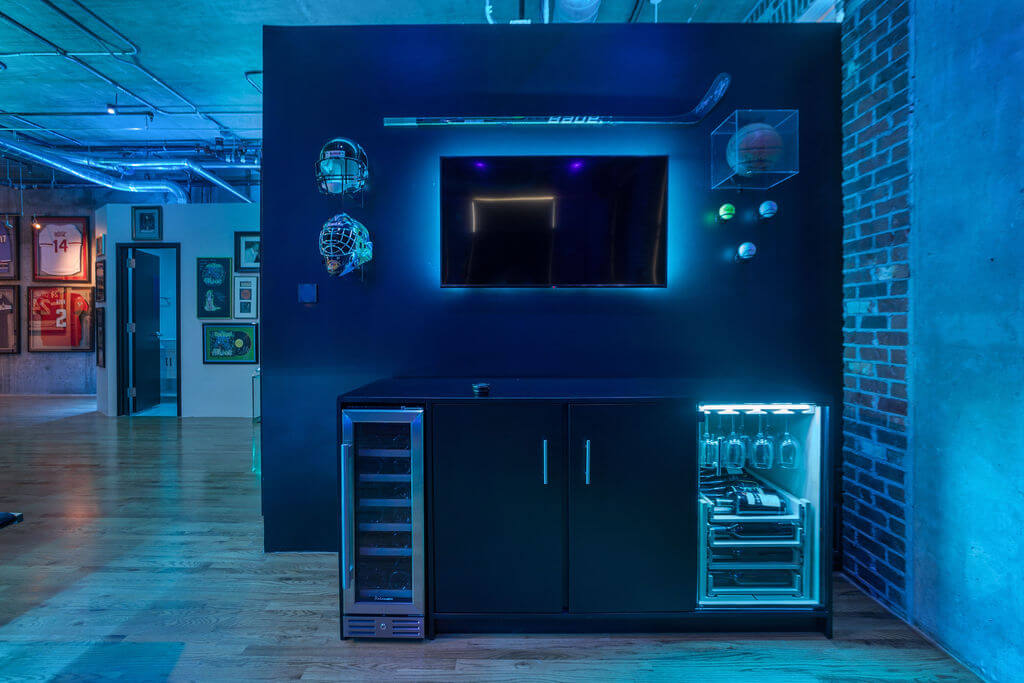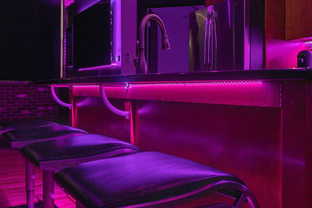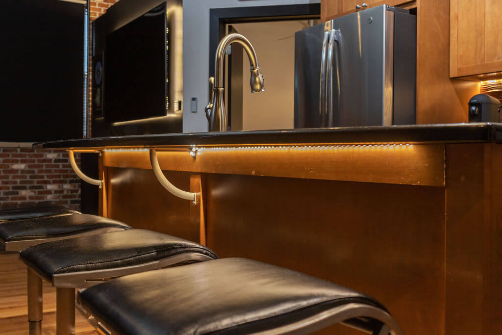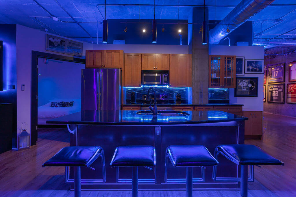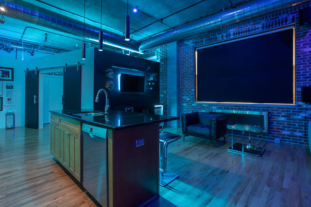 Na het voltooien van het eerste ontwerp om te voldoen aan de algemene ruimteverlichting, besloot de huiseigenaar dat hij meer wilde – veel meer. We voegden uiteindelijk heel wat LED Strips RGBW toe om de bovenkant van de muren, de TV’s aan de muur, onder het meubilair en zelfs achter sommige kunstwerken te accentueren, om zo een spannende, sfeervolle en eenvoudig te bedienen verlichtingsomgeving te creëren.