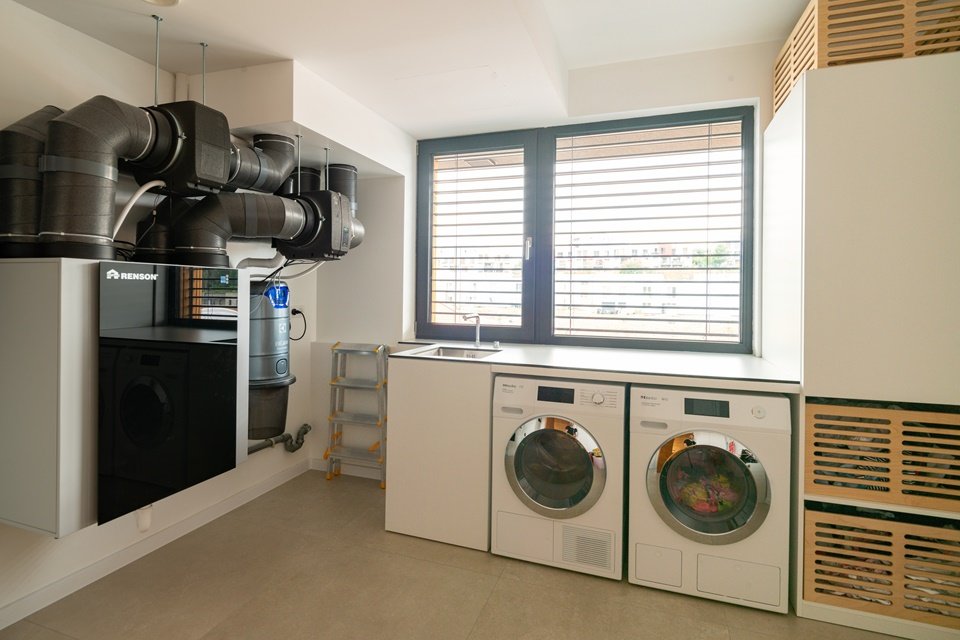 Met het Loxone systeem verloop alles automatisch, maar er is ook een Loxone Touch aanwezig in elke ruimte. Deze biedt niet alleen een snelle en eenvoudige bediening, maar meet ook de temperatuur en luchtvochtigheid. Deze gegevens zijn cruciaal om het verwarmings- of koelsysteem op het juiste moment aan te sturen. Bovendien wordt de luchtkwaliteit geregeld door middel van twee sensoren die geplaatst zijn in de slaapkamer en de leefruimte. Zo wordt er gezorgd voor een gezonde en comfortabele leefomgeving voor de bewoners.