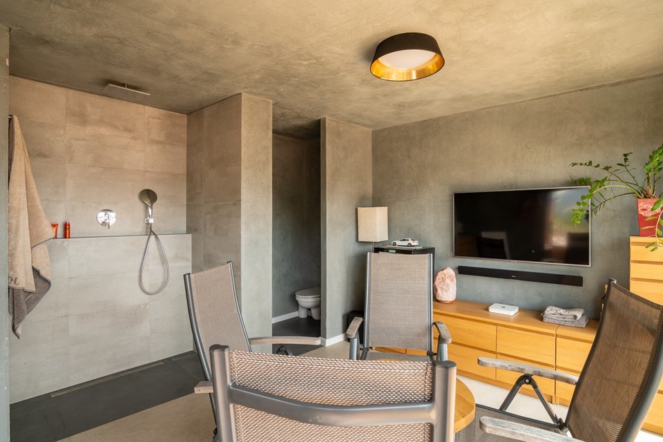 In elke ruimte van het huis zijn er meerdere lichtpunten geïnstalleerd. De leefruimte, bestaande uit een woonkamer, eetkamer en keuken, beschikt over maar liefst 17 verschillende lichtkringen, zodat de perfecte lichtsfeer op elk moment van de dag kan worden gecreëerd. Met behulp van de Loxone technologie worden de lichtinstellingen volledig geautomatiseerd en op elkaar afgestemd. Dankzij aanwezigheidsmelders hoeft de verlichting nooit handmatig te worden bediend.
