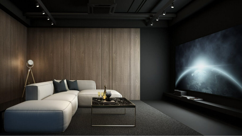 Het vermijden van galm is cruciaal in een home cinema ruimte. Om reflecties van geluid te minimaliseren, kunnen zachte materialen worden gebruikt. Denk hierbij aan een groot hoogpolig vloerkleed op de grond, stoffen gordijnen aan de wanden en accessoires zoals kussens en vilten opbergdozen.