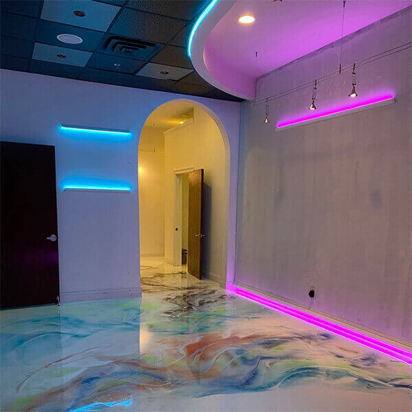 Jameel: We gebruikten kroonvormende LED kanalen om aangepaste verlichtingsarmaturen te maken die uiteindelijk werkten als wall-washers waarbij elke muur op een andere RGBW Dimmer werd geplaatst. Dit zorgde voor wat coole effecten bij de receptie, de wachtkamer en de andere ruimtes.