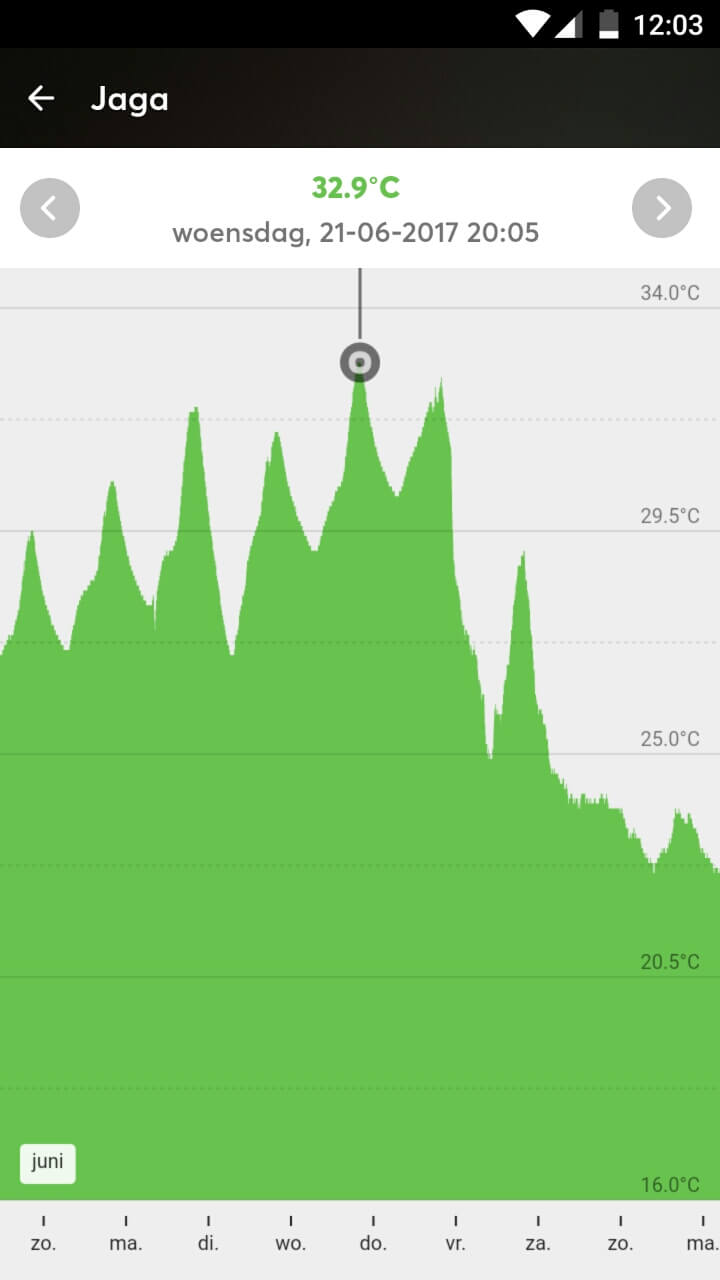 In september 2017 werd gelukkig onze zonwering geplaatst waardoor onze demowoning nooit meer te warm zal worden. Wij stellen zelf een maximale temperatuur in van 23°C. Vanaf de ruimtes te warm worden, sluit de zonwering automatisch om zo de woning op temperatuur te houden. Uiteraard zal tijdens de heetste dagen van het jaar de woning (waar geen actieve koeling aanwezig is) in zijn geheel ook opwarmen waardoor die 23°C geen realistische temperatuur blijft, maar thuiskomen in een woning van 25°C wanneer het buiten 35°C is, geeft toch een hele opluchting!