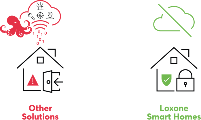 Het Loxone Smart Home bewijst dat de intelligente sturing van de eigen woning ook zonder een data cloud werkt. Dit zonder enige beperkingen in functionaliteiten of in de bediening. Dankzij de bijzondere aanpak waarbij de Miniserver alle transacties in de woning met elkaar laat spreken, is het Loxone systeem ook zonder externe rekenkracht veel krachtiger dan vele gadgets van het Internet of Things die slechts delen van het Smart Home dekken.